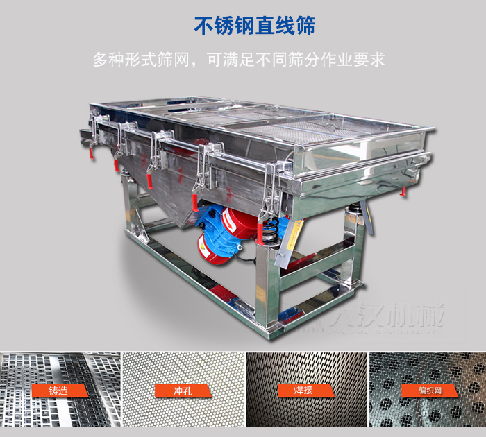 不銹鋼直線篩根據(jù)用戶現(xiàn)場(chǎng)要求可座式或吊式安裝,篩面有金屬編織網(wǎng)、鑄造、焊接、沖孔等多種形式,可滿足不同篩分作業(yè)要求。