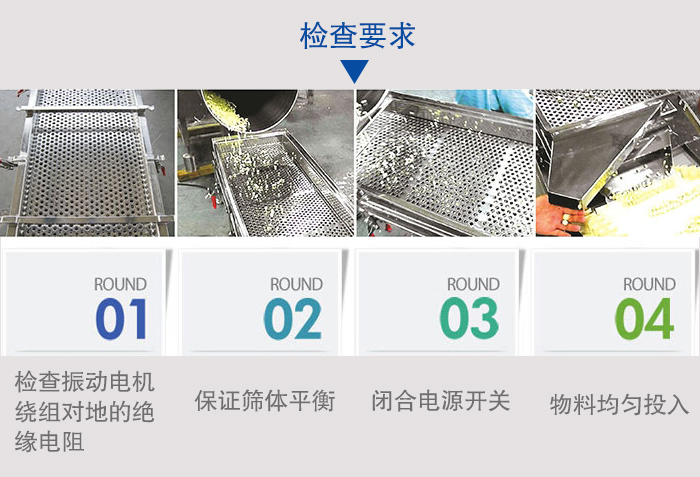 6、設(shè)備在停機(jī)時(shí)產(chǎn)生瞬間的共振區(qū),此時(shí)振幅和噪聲會(huì)明顯增大,屬正?,F(xiàn)象,設(shè)備在開停機(jī)前,不銹鋼直線篩篩面上不得有存留物料,篩網(wǎng)需經(jīng)常檢查是否張緊、破損,如有破損要即時(shí)更換。