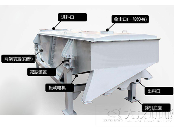 主要由篩箱、篩框、篩網(wǎng)、振動電機、電機臺座、減振彈簧、支架等部分組成。