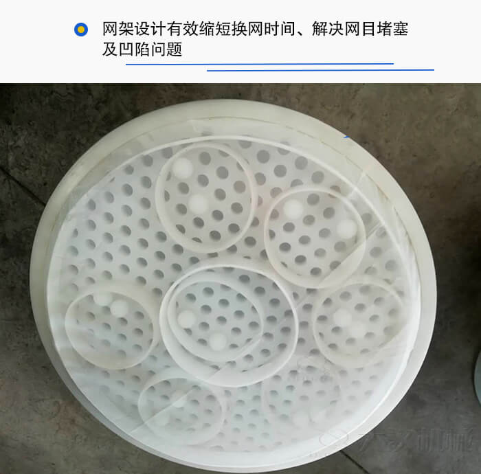 5、網(wǎng)架設(shè)計有效縮短換網(wǎng)時間、解決網(wǎng)目堵塞及凹陷問題,清洗方便,操作簡單;