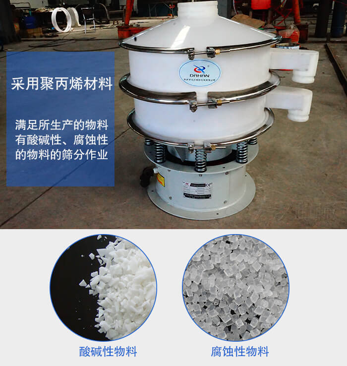 塑料振動篩也叫做聚丙烯振動篩,塑料防腐蝕振動篩,塑料旋振篩采用聚丙烯材料也叫PP材料通過特殊的加工工藝制作的用于滿足所生產(chǎn)的物料有酸堿性、腐蝕性的物料的篩分作業(yè)。塑料振動篩從篩框、篩網(wǎng)到清網(wǎng)裝置完全采用非金屬材料,徹底排除了一些特殊物料與金屬接觸會產(chǎn)生化學(xué)反應(yīng)的問題。