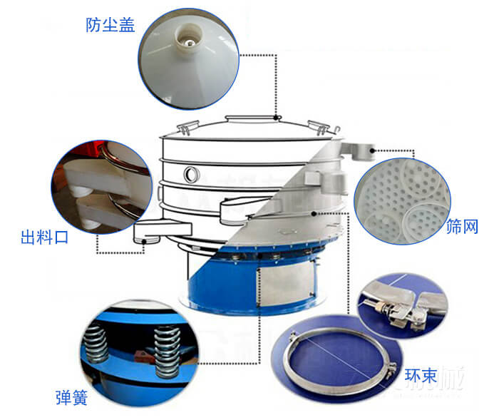 塑料振動篩主要由進(jìn)料口、防塵蓋、出料口、束環(huán)、篩網(wǎng)、配重塊、上部重錘、振動體、振動電機(jī)、彈簧、下部重錘、機(jī)座等部分組成。
