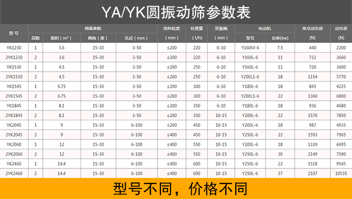 YA/YK系列圓振動(dòng)篩的型號(hào)是非常多的,每種型號(hào)價(jià)格都不一樣,具體如上表所示。