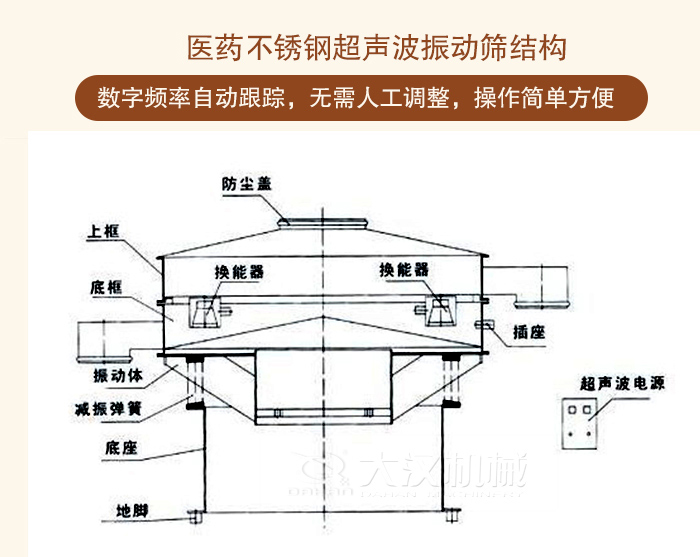5、篩網(wǎng): 適用于10目~635目。醫(yī)藥不銹鋼超聲波振動篩工作原理:超聲波篩分系統(tǒng)由超聲波諧振電源、振蕩器、共振環(huán)組成。
