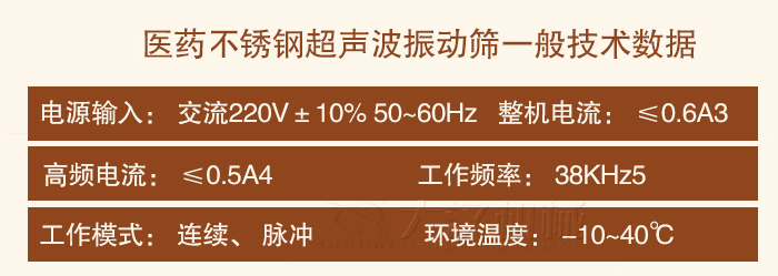 醫(yī)藥不銹鋼超聲波振動篩一般技術(shù)數(shù)據(jù):醫(yī)藥不銹鋼超聲波振動篩超聲波諧振電源:1、電源輸入: 交流220V±10% 50~60Hz2、整機電流: ≤0.6A3、高頻電流: ≤0.5A4、工作頻率: 38KHz5、工作模式: 連續(xù)、 脈沖6、環(huán)境溫度: -10~40℃