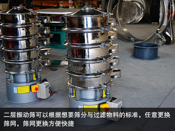 不銹鋼旋振篩是在碳鋼旋振篩基礎(chǔ)上,設(shè)計(jì)出的具有國內(nèi)先進(jìn)水平的振動篩分設(shè)備,用于篩分對材質(zhì)有特殊要求的物料。二層振動篩與不銹鋼旋振篩是同一種產(chǎn)品不過有兩種叫法,此篩機(jī)是采用新型YZUL系列單法蘭振動電機(jī),具有穩(wěn)定的激振力。這款振動篩可以篩分各種物料具有篩分特殊性、高粘度、細(xì)粒物料、細(xì)粉、微粉、及干、濕物料等多種物料,是篩分行業(yè)的好幫手。二層振動篩可以根據(jù)想要篩分與過濾物料的標(biāo)準(zhǔn),任意更換篩網(wǎng),篩網(wǎng)更換方便快捷。