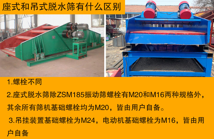 座式脫水篩除ZSM185振動篩螺栓有M20和M16兩種規(guī)格外,其余所有篩機(jī)基礎(chǔ)螺栓均為M20,皆由用戶自備。