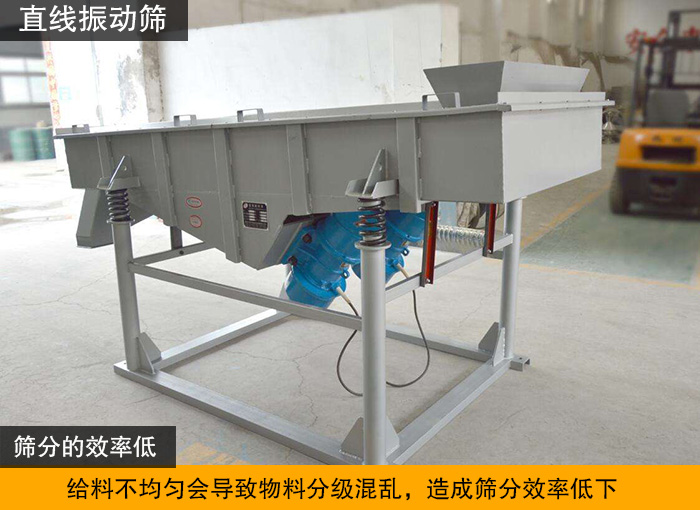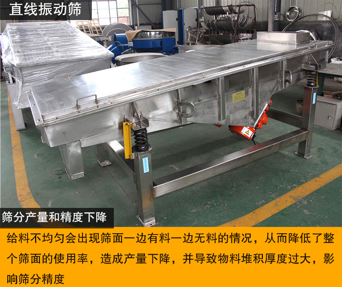 進(jìn)料不均勻時(shí),就會出現(xiàn)篩面一邊有料一邊無料的情況,從而降低了整個(gè)篩面的使用率,造成產(chǎn)量達(dá)不到要求的問題。除此之外,由于進(jìn)料不均勻,一側(cè)物料堆積太厚。一旦物料堆積厚度過大,將影響篩分效果精細(xì)度。達(dá)不到預(yù)期篩分效果。