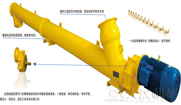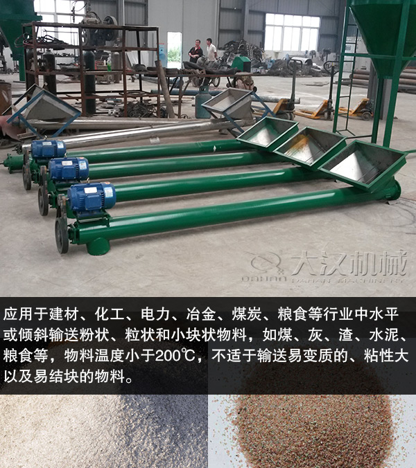 螺旋輸送機廣泛應用于建材、化工、電力、冶金、煤炭、糧食等行業(yè)中水平或傾斜輸送粉狀、粒狀和小塊狀物料,如煤、灰、渣、水泥、糧食等,物料溫度小于200℃,不適于輸送易變質的、粘性大以及易結塊的物料。