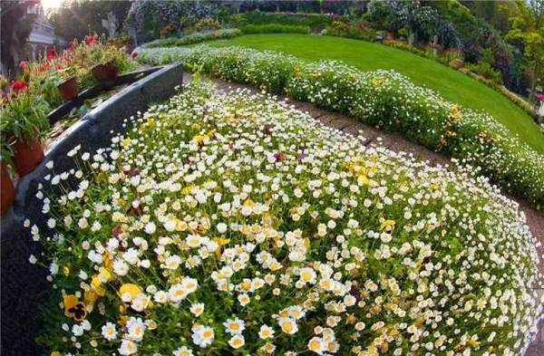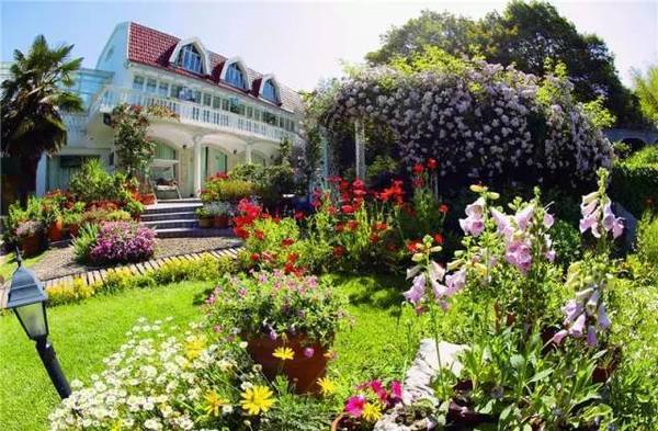園中心的一塊大草坪,是老張最珍視的地方,特意布置了紅色陶罐、日式石燈,搭配高大的毛地黃、瑪格麗特、紅色虞美人和白晶菊。