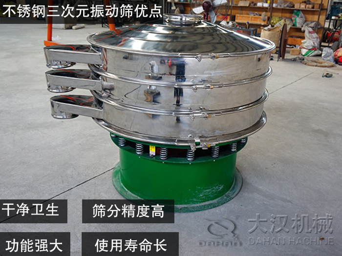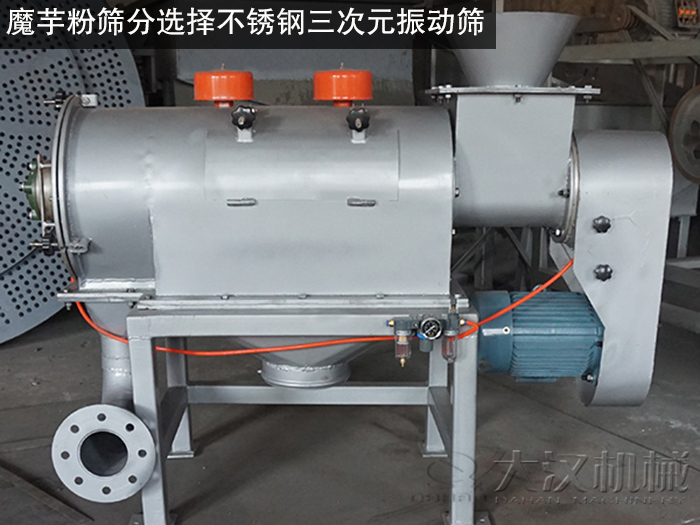 大漢機(jī)械的技術(shù)人員根據(jù)魔芋粉的特性選擇使用不銹鋼三次元振動(dòng)篩,進(jìn)行對(duì)其篩分作業(yè)。