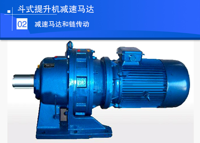 減速馬達(dá)和鏈傳動的傳動方式,一般用于提升能力和提升高度較小的低速提升機(jī),由于驅(qū)動功率較小,采用減速齒輪馬達(dá)和一級鏈傳動,也有不加鏈傳動的直聯(lián)方式,結(jié)構(gòu)緊湊,成本較低,但無法加慢速驅(qū)動裝置,逆止器也只能加在頭部驅(qū)動軸上。