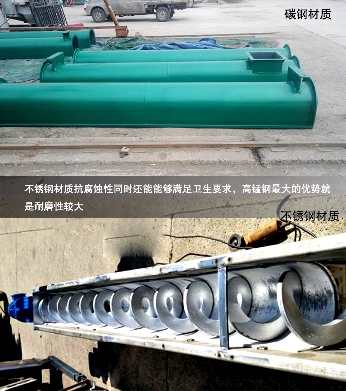 其他材質(zhì):其他材質(zhì)包括高錳鋼,高鉻鋼以及碳鋼材質(zhì),他們之間為不同的是高鉻鋼,有著不銹鋼的外在表象,看上去十分的明亮,但是相對(duì)于不銹鋼的性質(zhì)還是有一定區(qū)別的,同時(shí)也其他各種材質(zhì)的無(wú)軸螺旋輸送機(jī)。